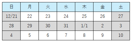 休業日:12月27日(土)~ 1月4日(日) 営業開始:1月5日(月)9:00~